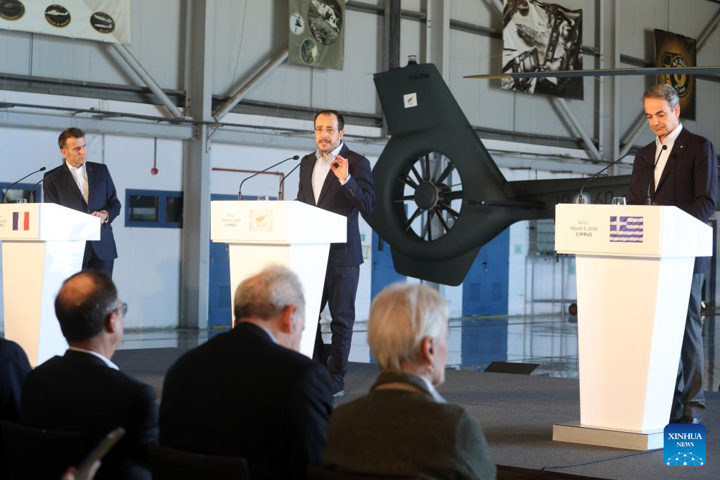 French President Emmanuel Macron (L), Cypriot President Nikos Christodoulides (C) and Greek Prime Minister Kyriakos Mitsotakis attend a press conference at the Andreas Papandreou air base in Paphos, Cyprus, on March 9, 2026. French President Emmanuel Macron said on Monday on social media platform X that the aircraft carrier Charles de Gaulle and its carrier strike group had arrived in waters near Cyprus. Macron made the remarks while visiting Cyprus earlier in the day at the invitation of Cypriot President Nikos Christodoulides, alongside Greek Prime Minister Kyriakos Mitsotakis. (Photo by George Christophorou/Xinhua)