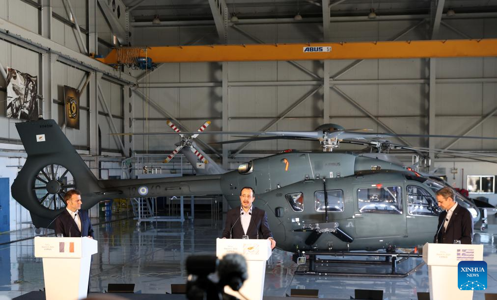 Macron made the remarks while visiting Cyprus earlier in the day at the invitation of Cypriot President Nikos Christodoulides, alongside Greek Prime Minister Kyriakos Mitsotakis. (Photo by George Christophorou/Xinhua)