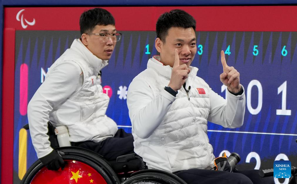 Zhang Mingliang (R) of China celebrates after winning the wheelchair curling mixed team round robin session 6 match between China and Norway at the Milan-Cortina 2026 Paralympic Winter Games in Cortina D'ampezzo, Italy, March 9, 2026. (Xinhua/Wang Kaiyan)
