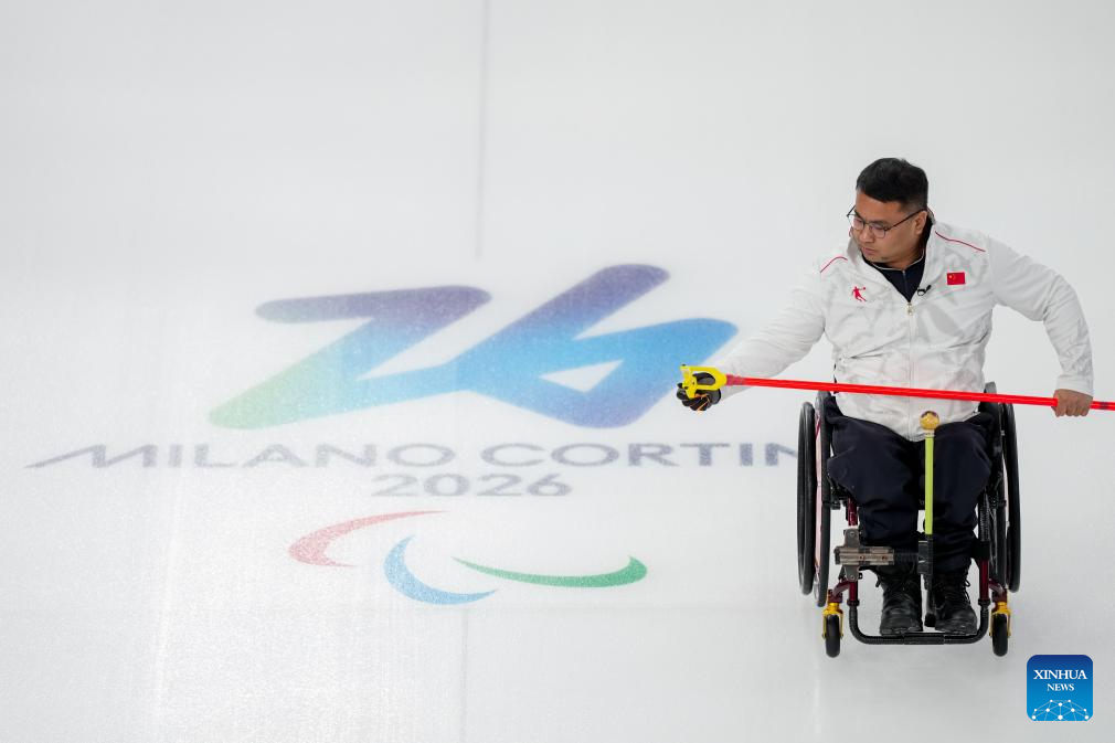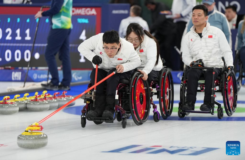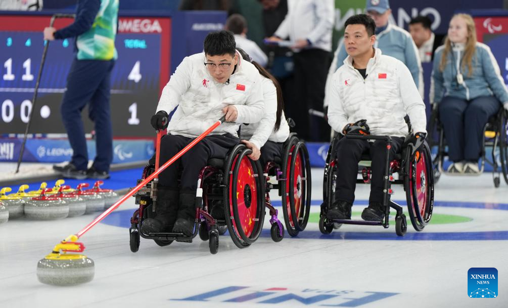 Zhang Mingliang (C) of China competes during the wheelchair curling mixed team round robin session 6 match between China and Norway at the Milan-Cortina 2026 Paralympic Winter Games in Cortina D'ampezzo, Italy, March 9, 2026. (Xinhua/Wang Kaiyan)