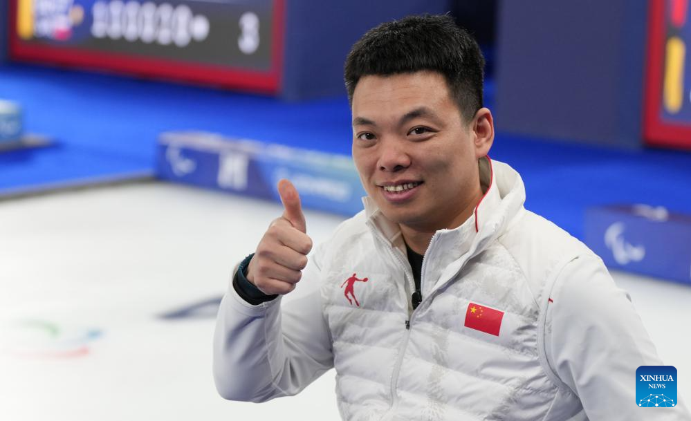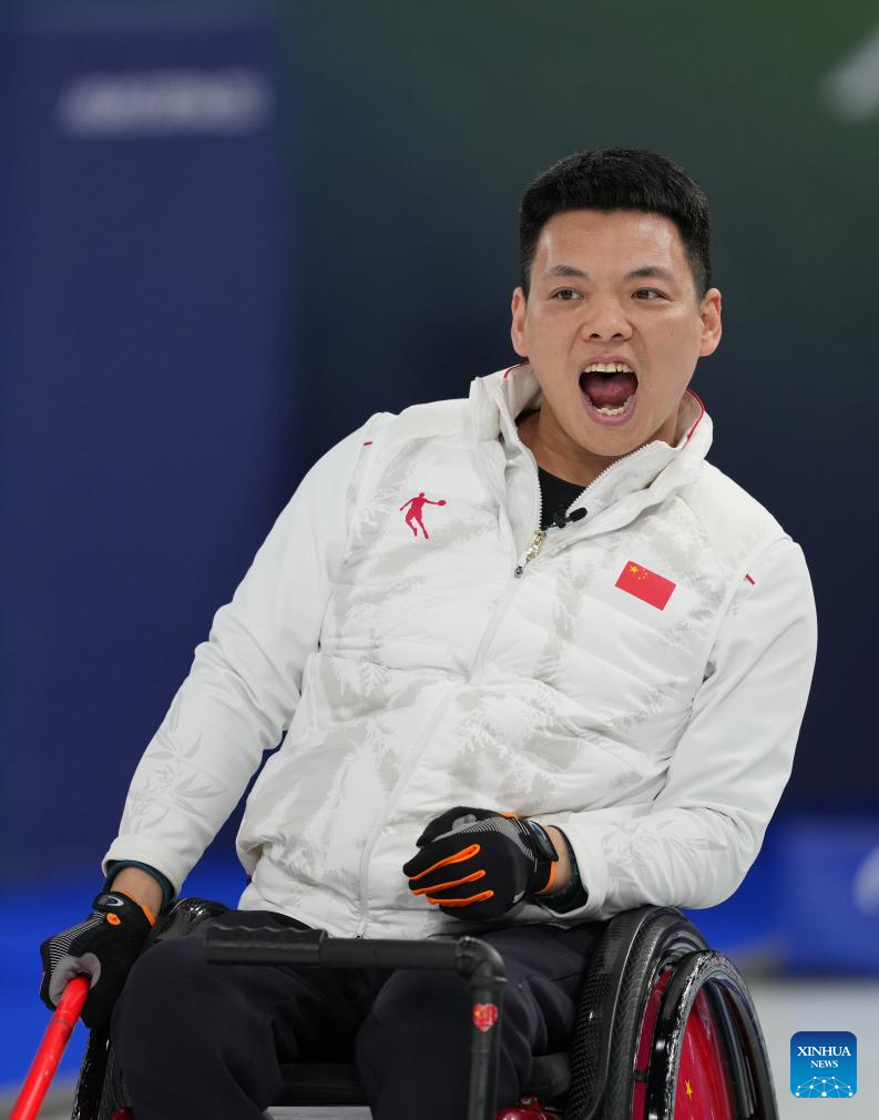 Zhang Mingliang of China celebrates after winning the wheelchair curling mixed team round robin session 6 match between China and Norway at the Milan-Cortina 2026 Paralympic Winter Games in Cortina D'ampezzo, Italy, March 9, 2026. (Xinhua/Wang Kaiyan)