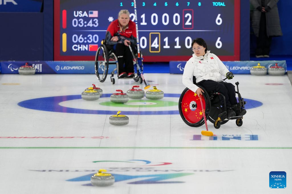 Wang Meng (R) of China competes during the wheelchair curling mixed doubles round robin session 7 between China and the United States at the Milan-Cortina 2026 Paralympic Winter Games in Cortina D'ampezzo, Italy, March 9, 2026. (Xinhua/Lian Yi)