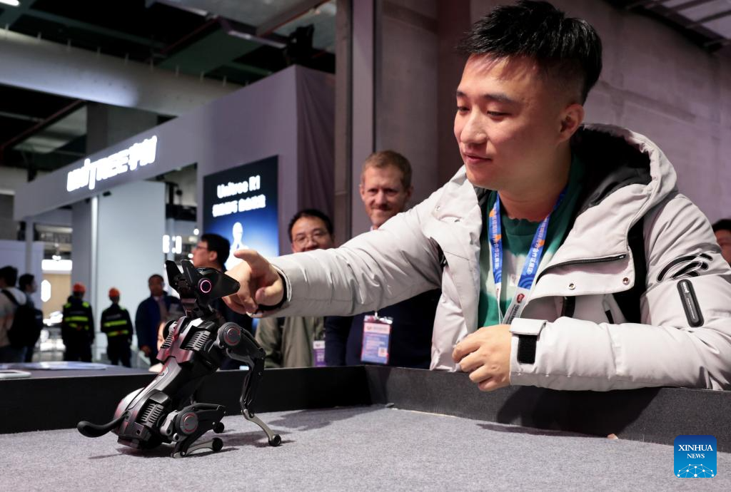 A visitor interacts with a robotic dog during the 2026 Appliance & Electronics World Expo (AWE2026) in east China's Shanghai, March 12, 2026. The AWE2026 kicked off in Shanghai on Thursday. More than 1,200 enterprises from all over the world gathered at the expo to showcase their latest innovations. (Xinhua/Fang Zhe)