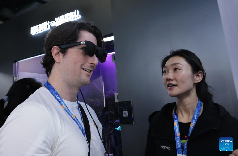 A visitor tries a pair of smart glasses during the 2026 Appliance & Electronics World Expo (AWE2026) in east China's Shanghai, March 12, 2026. The AWE2026 kicked off in Shanghai on Thursday. More than 1,200 enterprises from all over the world gathered at the expo to showcase their latest innovations. (Xinhua/Fang Zhe)