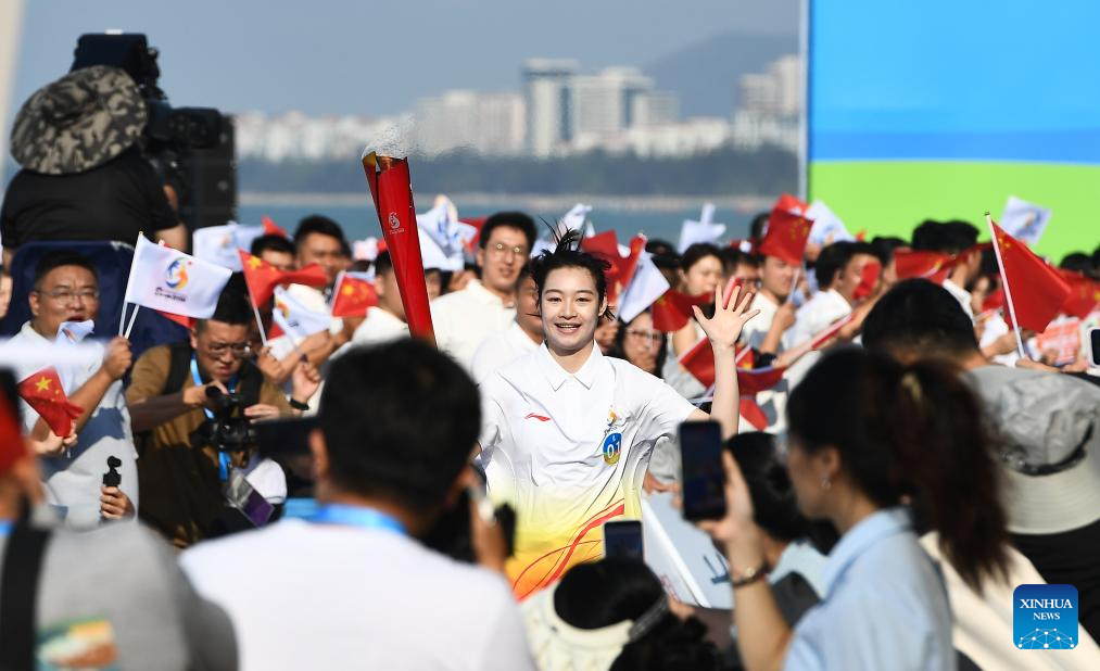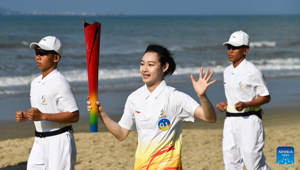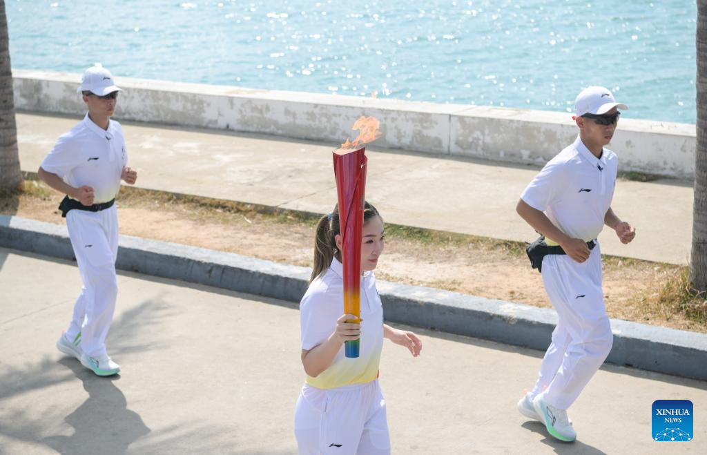 Chinese diver Chang Yani runs holding the torch during the torch relay for the 6th Asian Beach Games Sanya 2026 in Sanya, south China's Hainan Province, March 30, 2026. (Xinhua/Yang Guanyu)