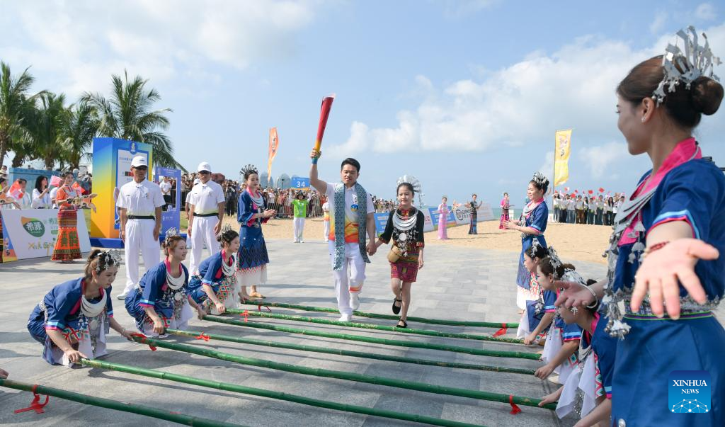 Chinese weightlifter Shi Zhiyong (2nd L) holds the torch during the torch relay for the 6th Asian Beach Games Sanya 2026 in Sanya, south China's Hainan Province, March 30, 2026. (Xinhua/Yang Guanyu)