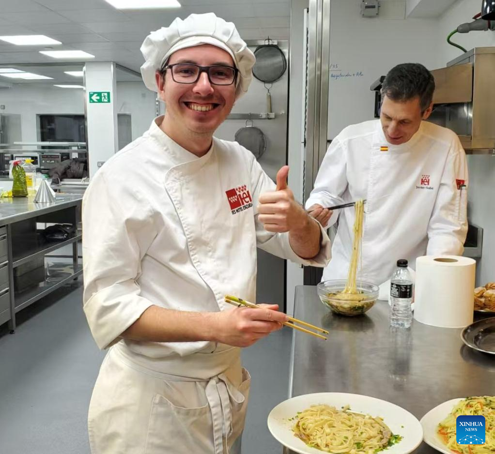LANZHOU, March 30 (Xinhua) -- With swift and practiced hands, 42-year-old Peng Jingjing twisted, stretched and folded dough into slender strands before a dozen students at the I.E.S. Hotel Escuela in Madrid, bringing the art of hand-pulled noodles to life.
