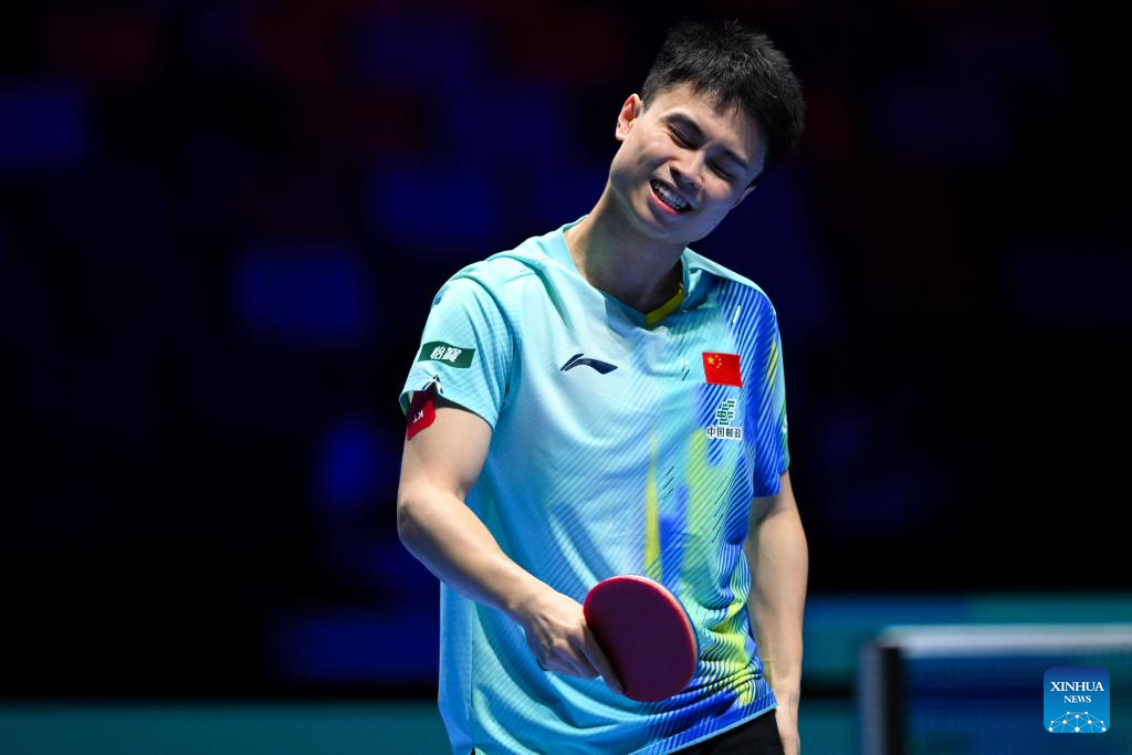 Zhou Qihao reacts during the men's singles group 16 match between Zhou Qihao of China and Kawakami Ryuusei of Japan at the ITTF Men's and Women's World Cup 2026 in Macao, China, March 30, 2026. (Xinhua/Cheong Kam Ka)