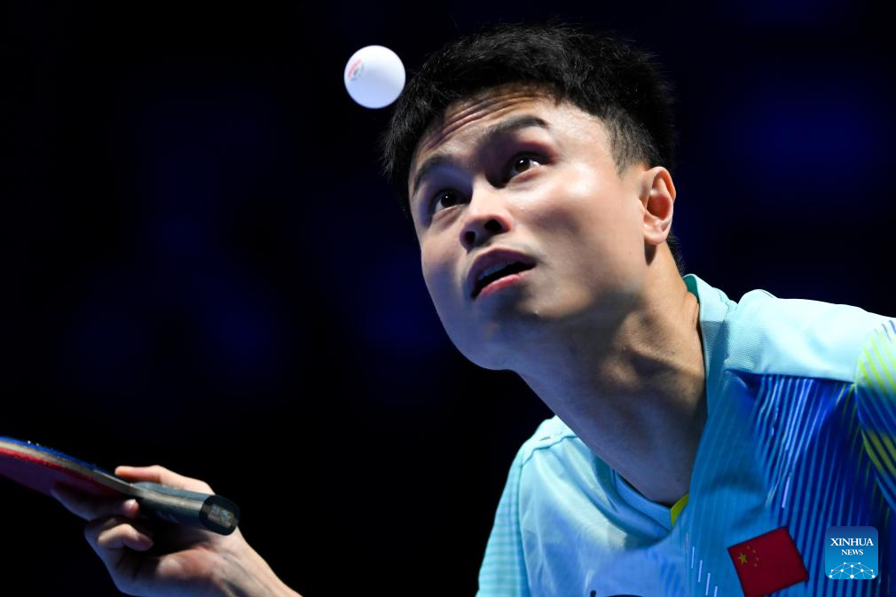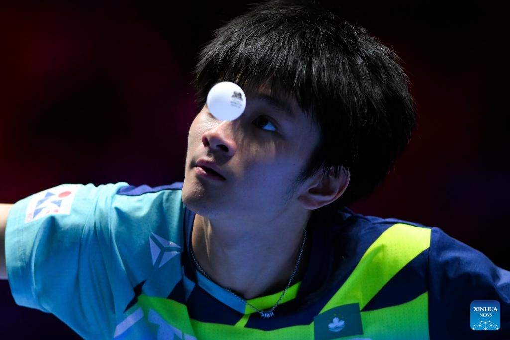 Zhou Qihao hits a return during the men's singles group 16 match between Zhou Qihao of China and Kawakami Ryuusei of Japan at the ITTF Men's and Women's World Cup 2026 in Macao, China, March 30, 2026. (Xinhua/Cheong Kam Ka)
