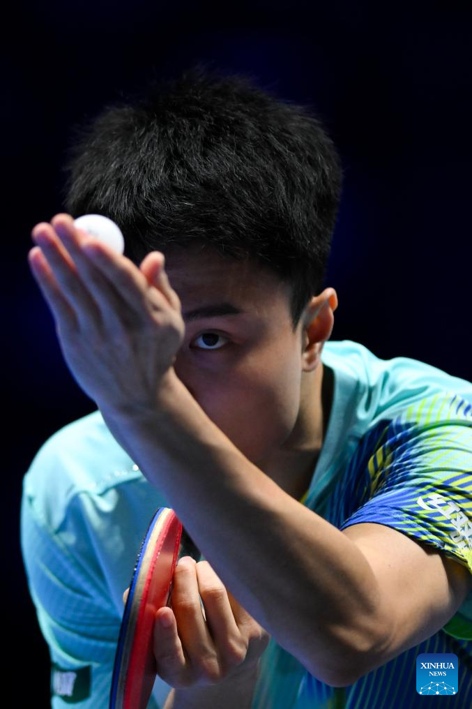 Zhou Qihao serves during the men's singles group 16 match between Zhou Qihao of China and Kawakami Ryuusei of Japan at the ITTF Men's and Women's World Cup 2026 in Macao, China, March 30, 2026. (Xinhua/Cheong Kam Ka)
