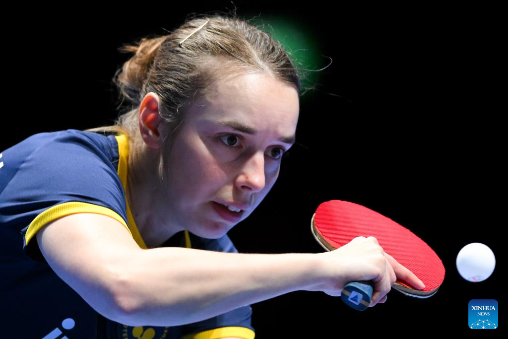 Andreea Dragoman competes during the women's singles group 3 match between Chen Xingtong of China and Andreea Dragoman of Sweden at the ITTF Men's and Women's World Cup 2026 in Macao, China, March 30, 2026. (Xinhua/Yu Yang)