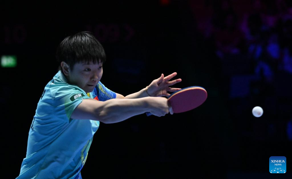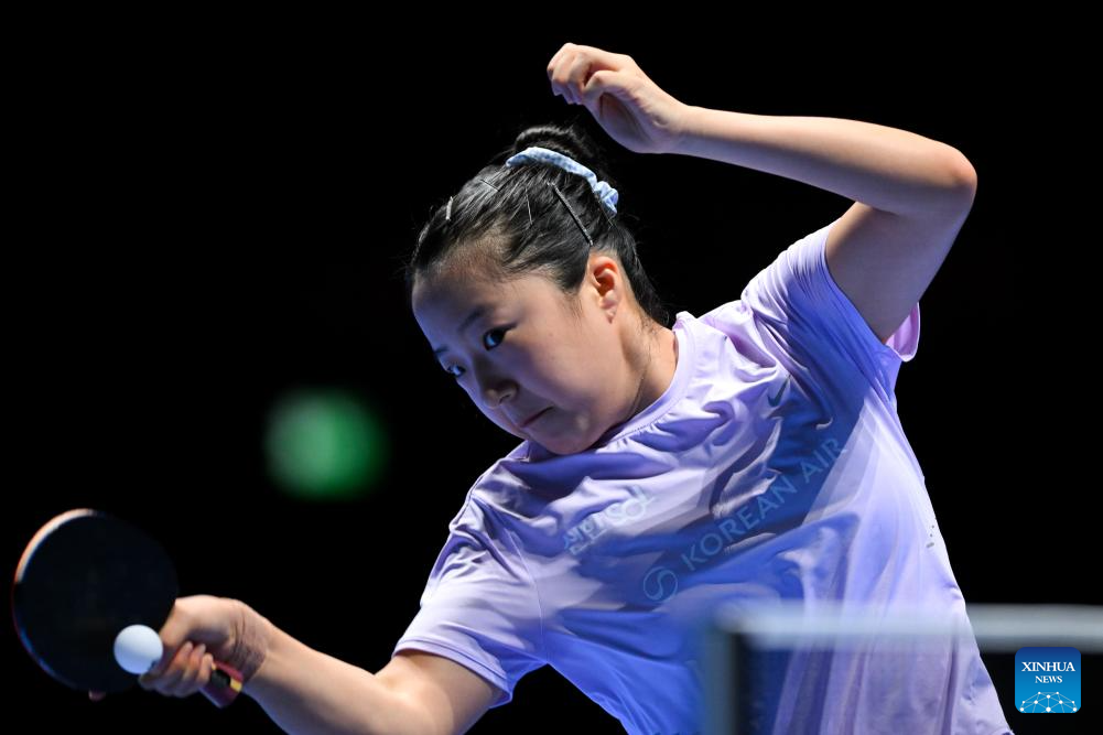 South Korea's Shin Yubin hits a return during the women's singles group 10 match between Shin Yubin of South Korea and Linda Bergstrom of Sweden at the ITTF Men's and Women's World Cup 2026 in Macao, China, March 30, 2026. (Xinhua/Cheong Kam Ka)