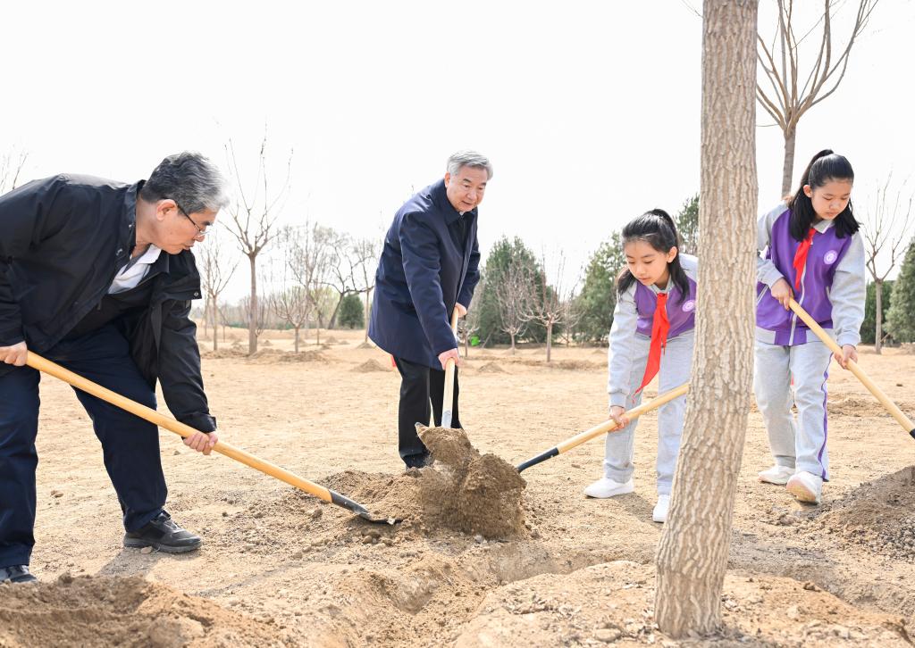 Wang Huning plants a tree during a voluntary tree-planting activity at Baishan Town in Changping District of Beijing, capital of China, March 30, 2026. Party and state leaders Xi Jinping, Li Qiang, Zhao Leji, Wang Huning, Cai Qi, Ding Xuexiang, and Li Xi took part in a voluntary tree-planting activity in Changping District of Beijing on Monday. (Xinhua/Huang Jingwen)