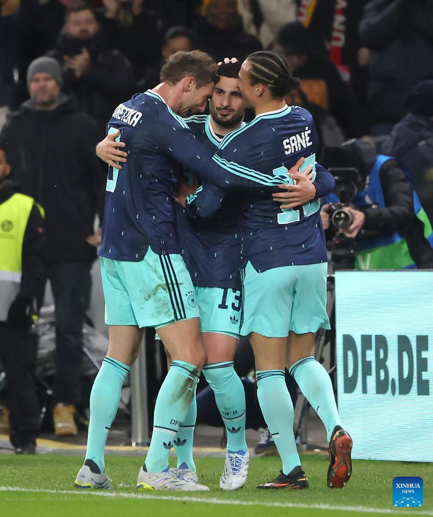 Deniz Undav (C) of Germany celebrates scoring with teammates during an international friendly football match between Germany and Ghana in Stuttgart, Germany, March 30, 2026. (Photo by Philippe Ruiz/Xinhua)