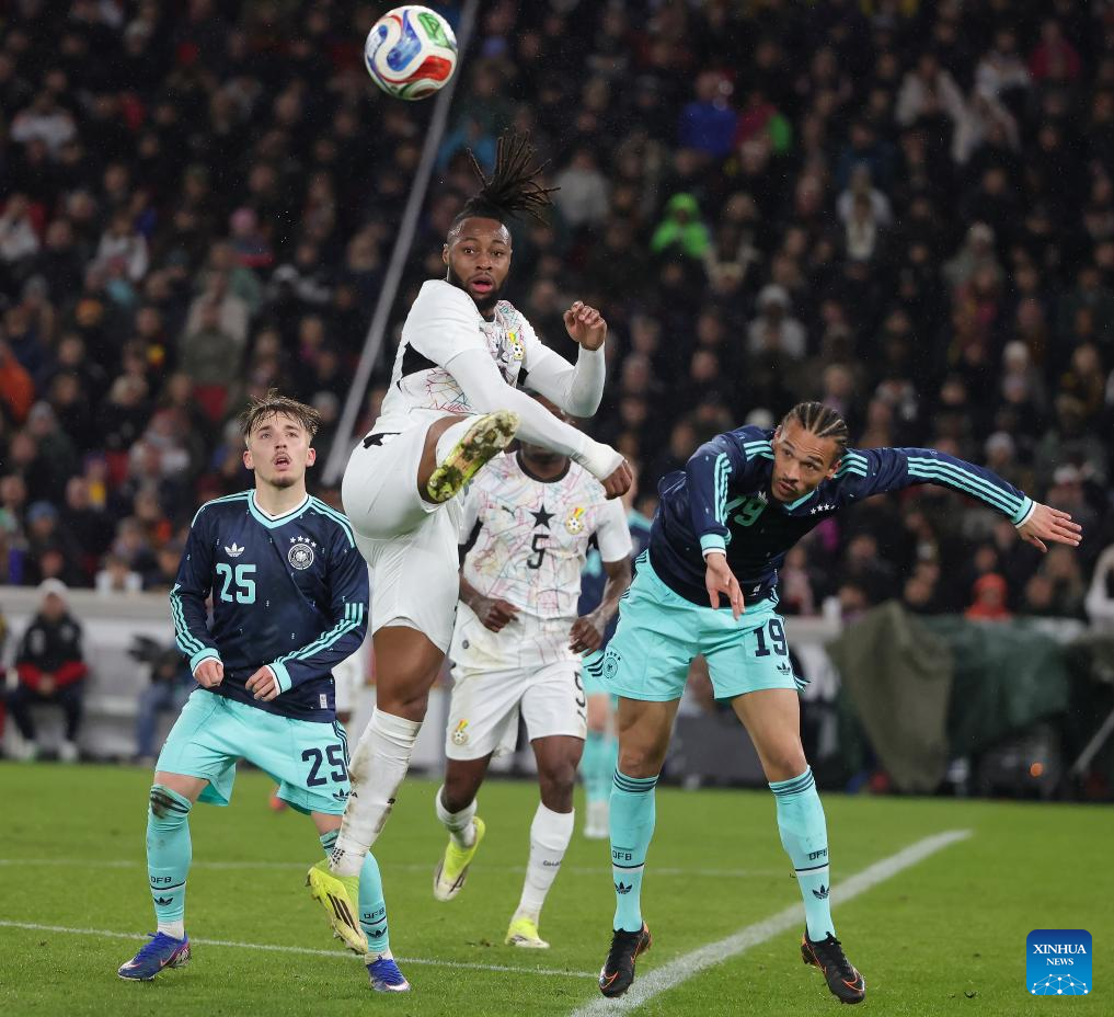 Abdul Fatawu (R) of Ghana scores during an international friendly football match between Germany and Ghana in Stuttgart, Germany, March 30, 2026. (Photo by Philippe Ruiz/Xinhua)