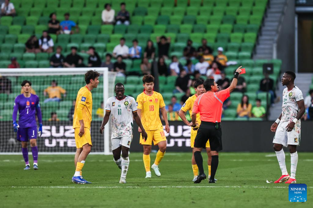 Stephane Keller (1st R) of Cameroon is sent-off by referee for 2nd yellow card during the FIFA Series 2026 International Friendly Match between China and Cameroon in Melbourne, Australia, March 31, 2026. (Photo by Jin Cheng/Xinhua)