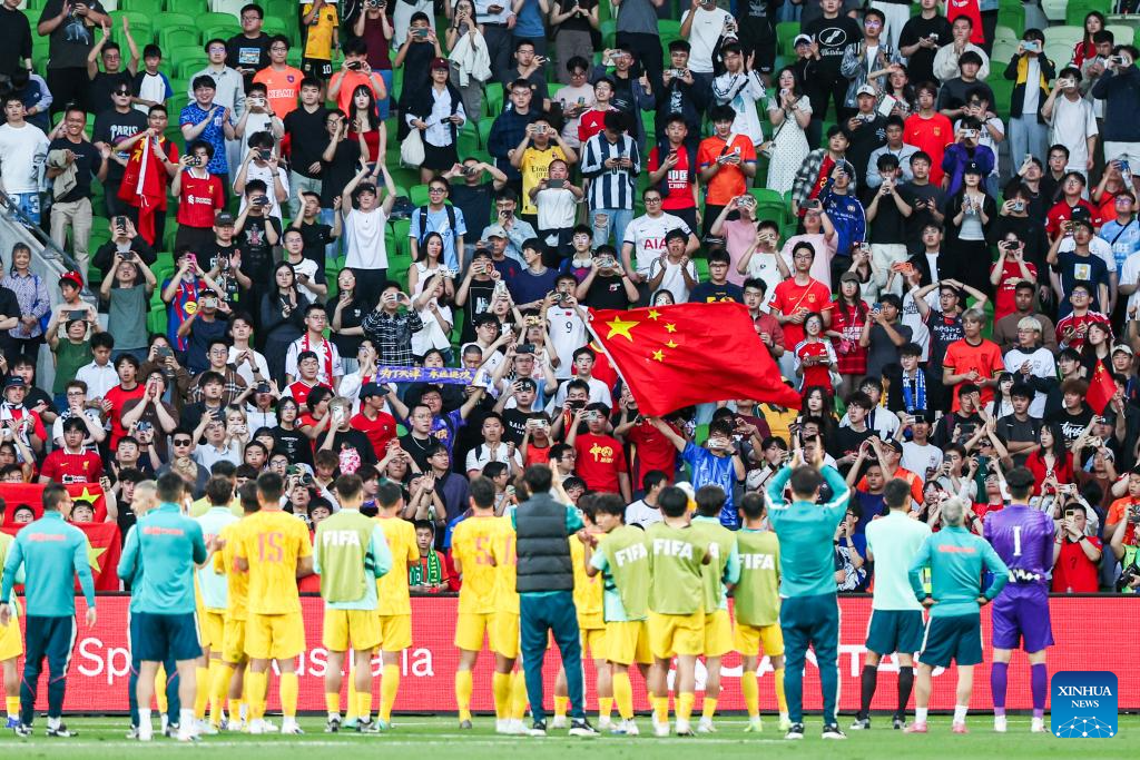 Team China thanks supporters after the FIFA Series 2026 International Friendly Match between China and Cameroon in Melbourne, Australia, March 31, 2026. (Photo by Shu Zelin/Xinhua)