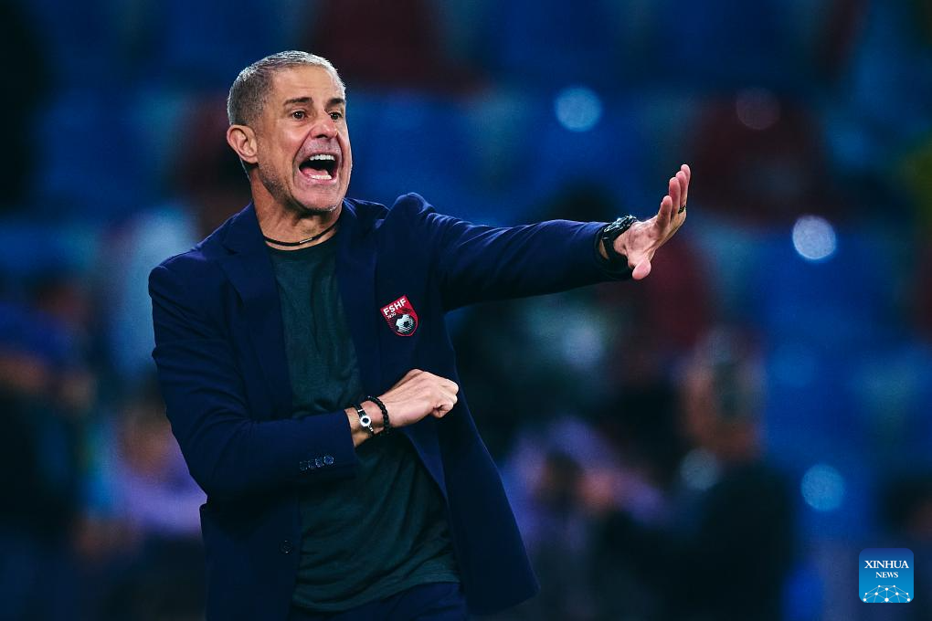 Sylvinho, head coach of Albania gestures during an international friendly football match between Ukraine and Albania in Valencia, Spain, March 31, 2026. (Xinhua)