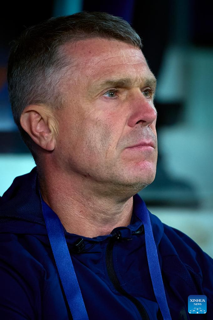 Serhiy Rebrov, head coach of Ukraine, reacts before an international friendly football match between Ukraine and Albania in Valencia, Spain, March 31, 2026. (Xinhua)