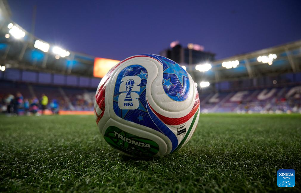 The official ball of World Cup is seen before an international friendly football match between Ukraine and Albania in Valencia, Spain, March 31, 2026. (Xinhua)
