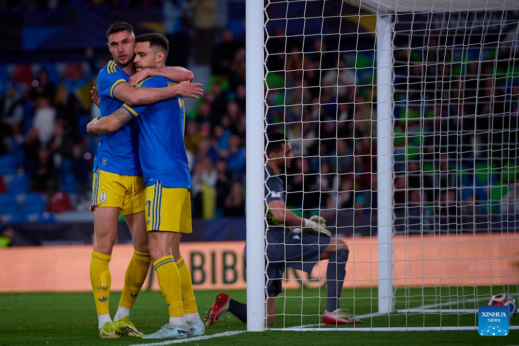 Oleksiy Hutsulyak (R) of Ukraine celebrates his goal with a teammate during an international friendly football match between Ukraine and Albania in Valencia, Spain, March 31, 2026. (Xinhua)