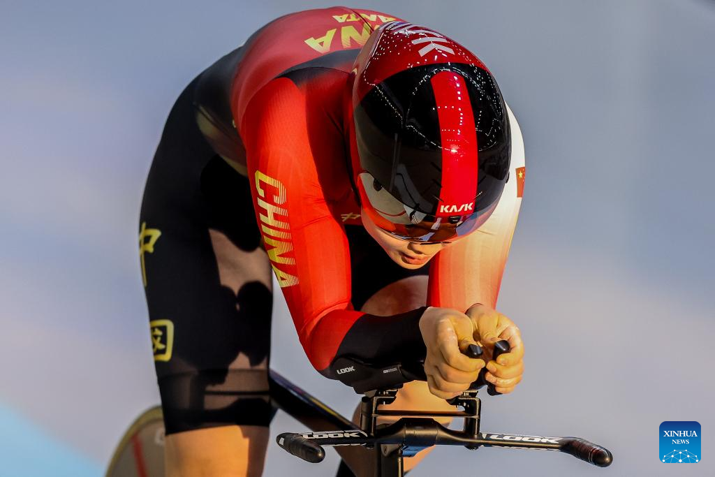 Xie Han of China competes during the men elite - 1km time trial final at the 2026 Asian Track Championships in Tagaytay City, the Philippines, on March 31, 2026. (Xinhua/Rouelle Umali)