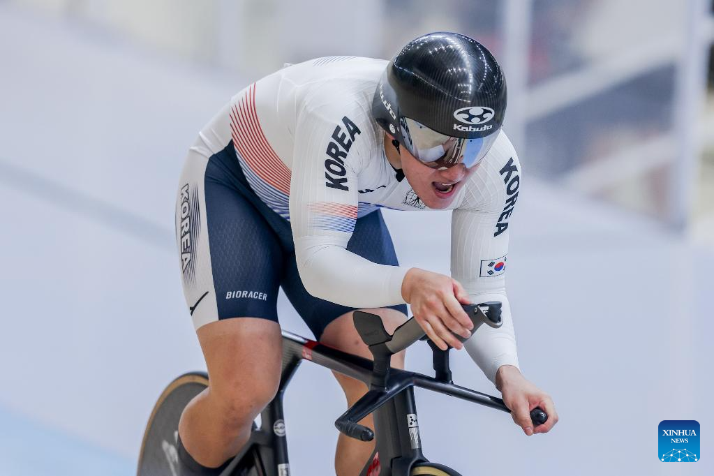 Jung Hojin of South Korea competes during the men elite - 1km time trial final at the 2026 Asian Track Championships in Tagaytay City, the Philippines, on March 31, 2026. (Xinhua/Rouelle Umali)