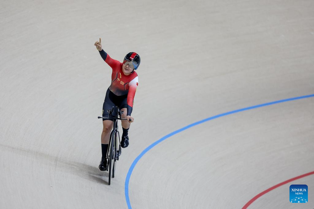 Luo Xuehuang of China celebrates during the women elite - 1km time trial final at the 2026 Asian Track Championships in Tagaytay City, the Philippines, on March 31, 2026. (Xinhua/Rouelle Umali)