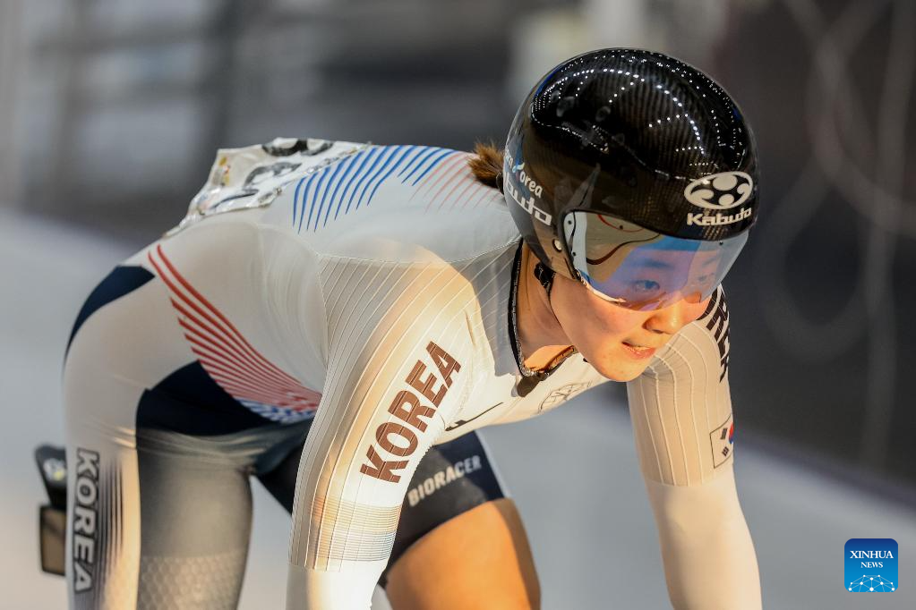 Hwang Hyeonseo of South Korea competes during the women elite - 1km time trial final at the 2026 Asian Track Championships in Tagaytay City, the Philippines, on March 31, 2026. (Xinhua/Rouelle Umali)