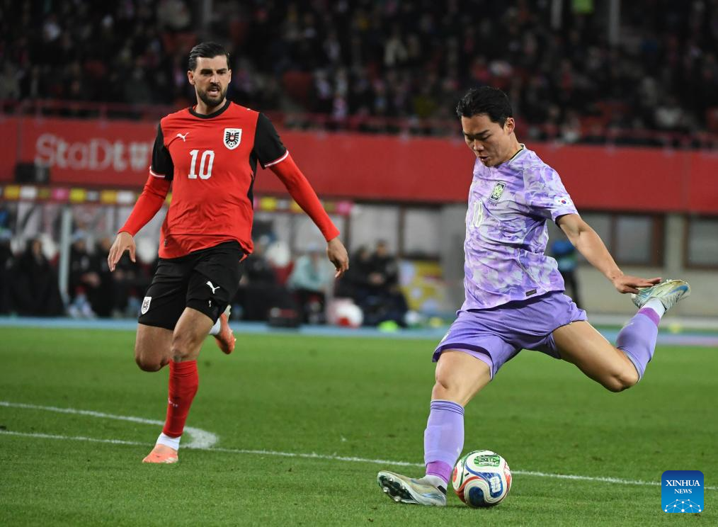 Lee Kang-in (1st R) of South Korea shoots during a friendly match between Austria and South Korea in Vienna, Austria, on March 31, 2026. (Xinhua/He Canling)