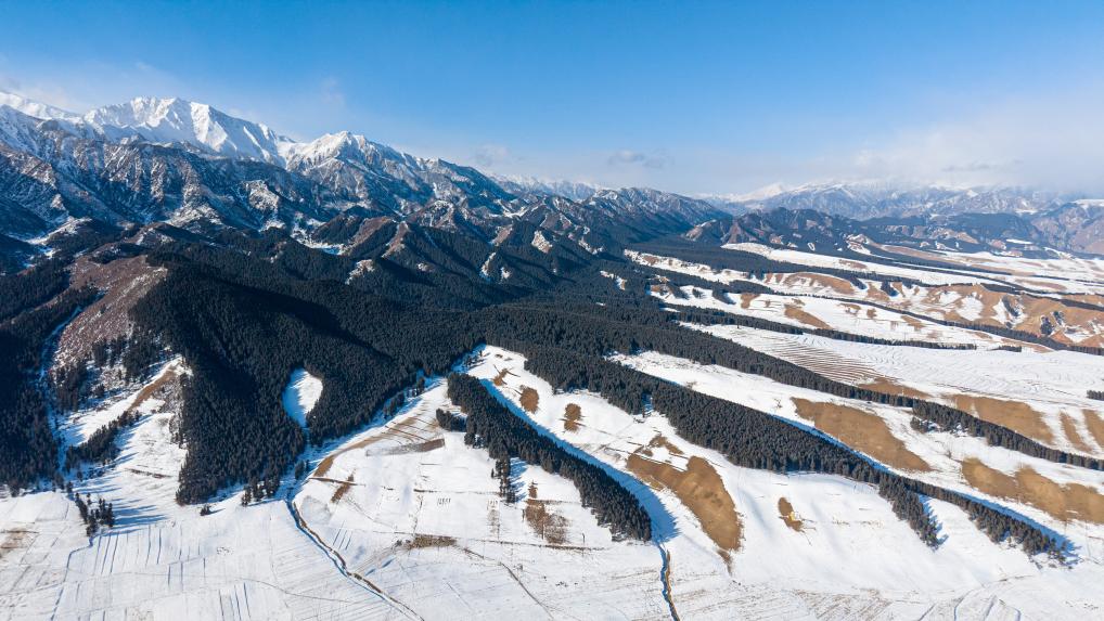 A drone photo taken on Jan. 15, 2025 shows the snow scenery of Qilian Mountains in Tianzhu County of Wuwei City, northwest China's Gansu Province. (Xinhua/Lang Bingbing)