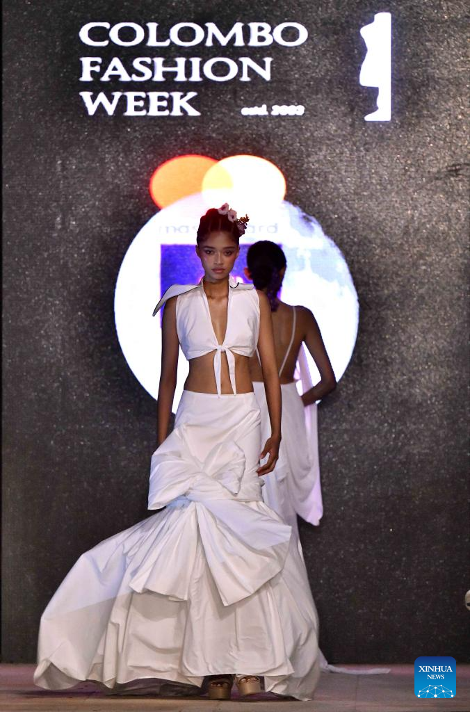 A model presents a creation during the Colombo Fashion Week in Colombo, Sri Lanka on April 1, 2026. The Colombo Fashion Week Summer 2026 takes place from April 1 to 4. The four-day event showcases creations from more than 30 designers. (Photo by Ajith Perera/Xinhua)
