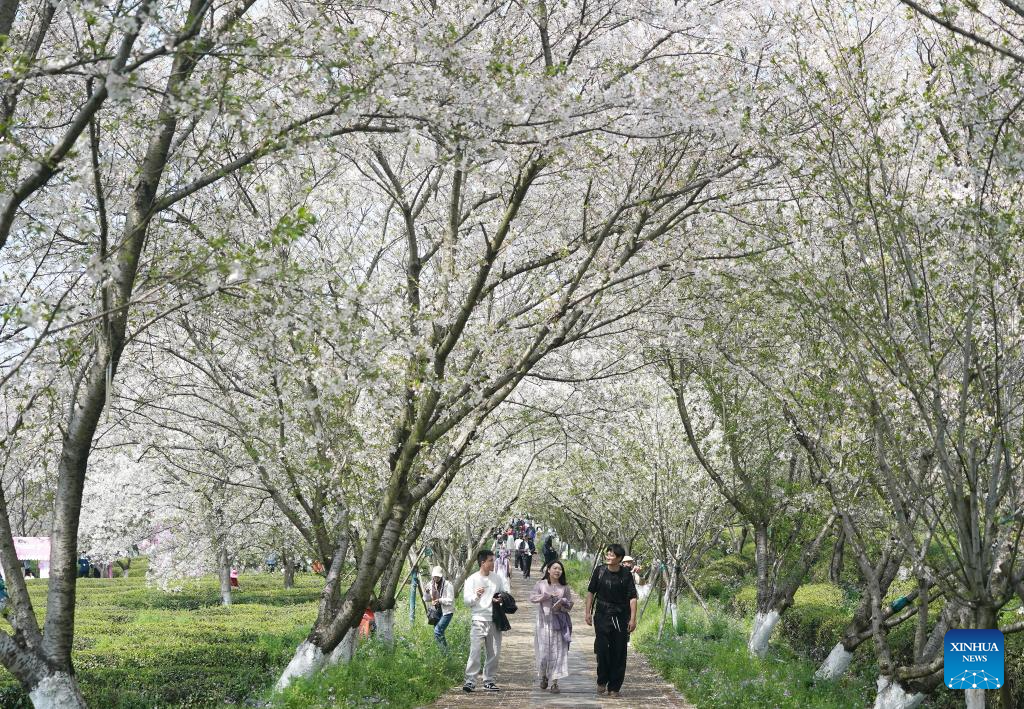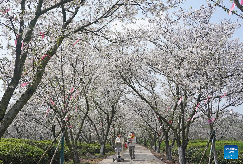 People enjoy the scenery of cherry blossoms in Nanchang County of east China's Jiangxi Province, April 1, 2026. (Xinhua/Wan Xiang)