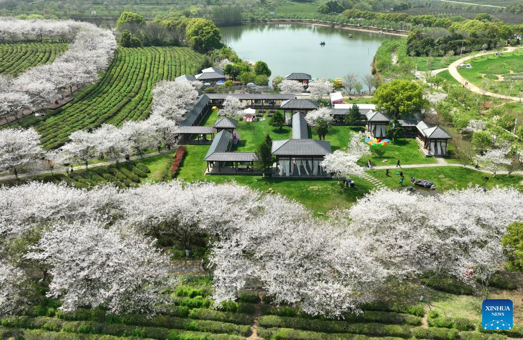 An aerial drone photo taken on April 1, 2026 shows the scenery of cherry blossoms in Nanchang County of east China's Jiangxi Province. (Xinhua/Wan Xiang)