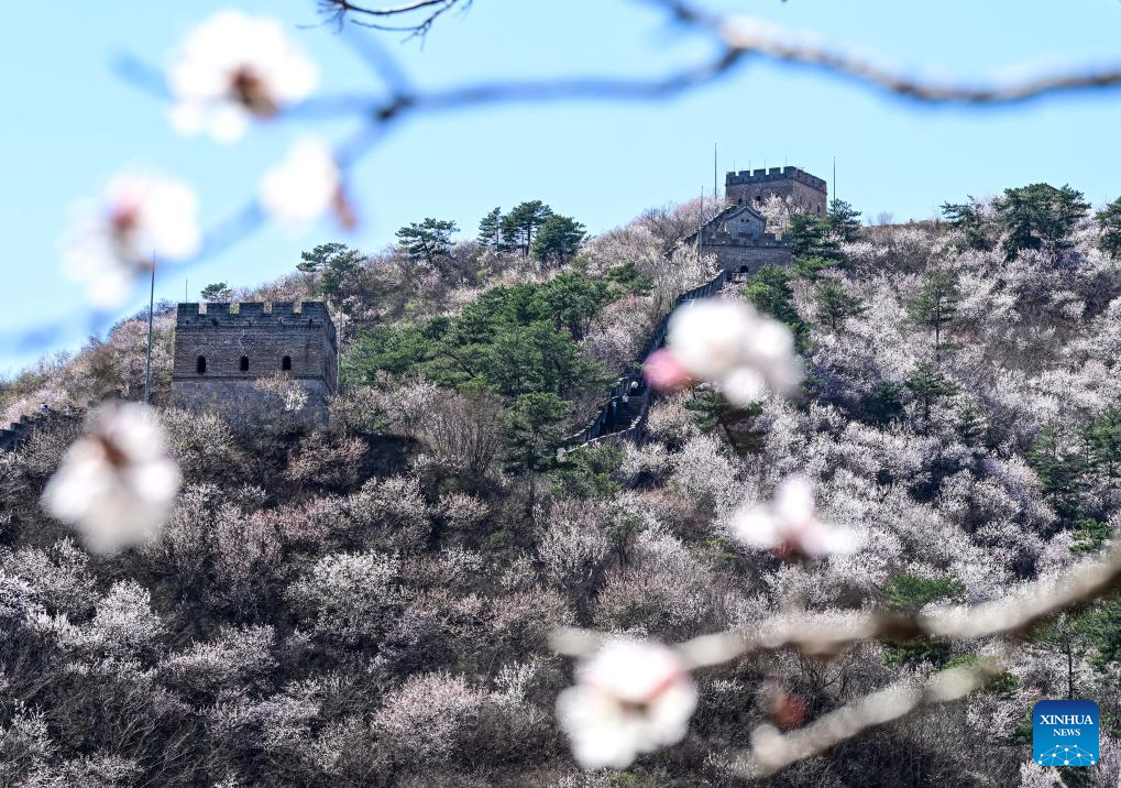 This photo taken on April 1, 2026 shows blooming flowers at Huanghuacheng Lakeside Great Wall in Huairou District of Beijing, capital of China. (Xinhua/Chen Yehua)