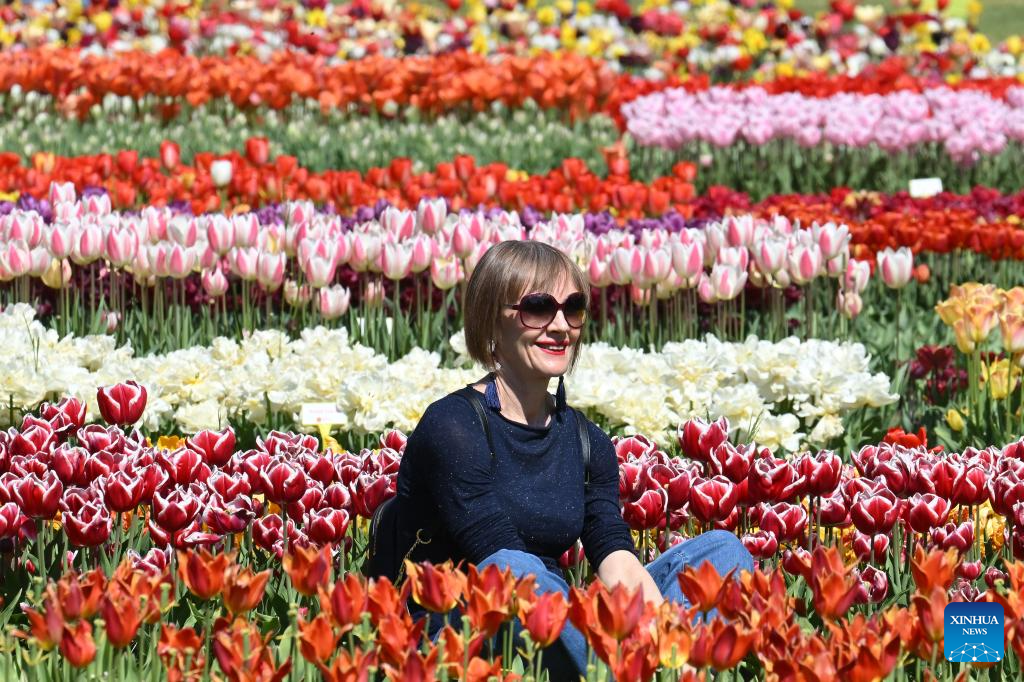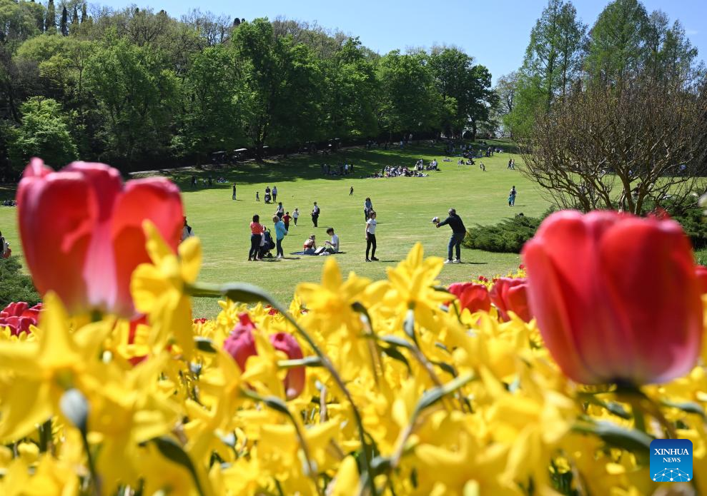 People enjoy blooming flowers at a park in Valeggio sul Mincio, Verona, Italy, April 4, 2026. (Photo by Alberto Lingria/Xinhua)