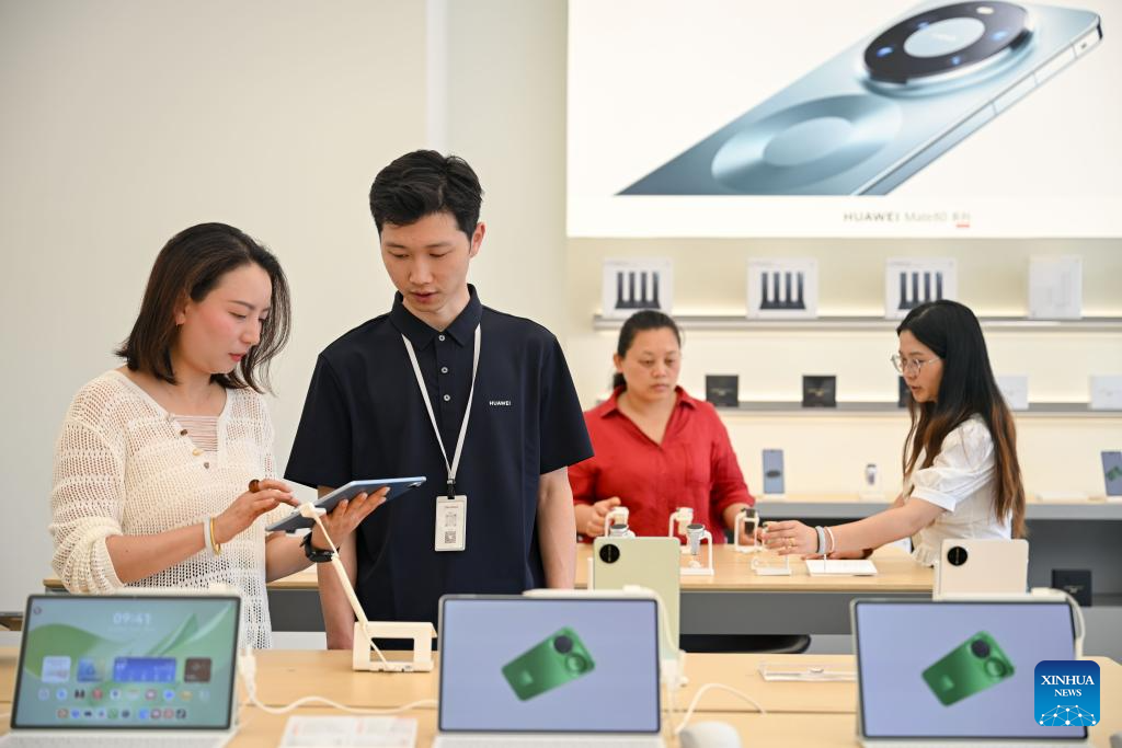 People shop for digital products at a consumer electronics store in Guiyang, southwest China's Guizhou Province, April 10, 2026.