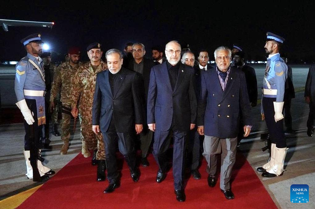 A high-level Iranian delegation led by Parliament Speaker Mohammad Baqer Qalibaf (C) arrives in Islamabad of Pakistan to participate in the upcoming talks with the United States, on the early morning of April 11, 2026. (Xinhua)