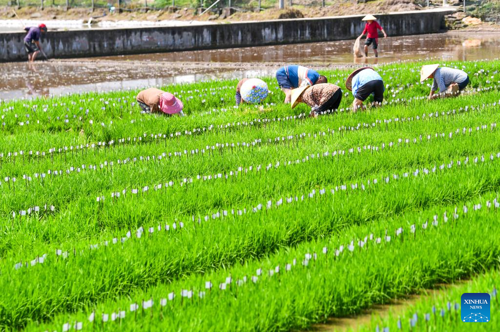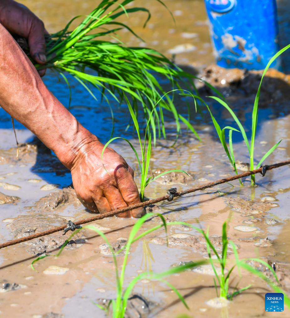 Farmers transplant rice seedlings in the fields of Weituo Town, Hechuan District, southwest China's Chongqing, April 18, 2026. The fields in Hechuan District of Chongqing are bustling with farming activity during the spring plowing season.