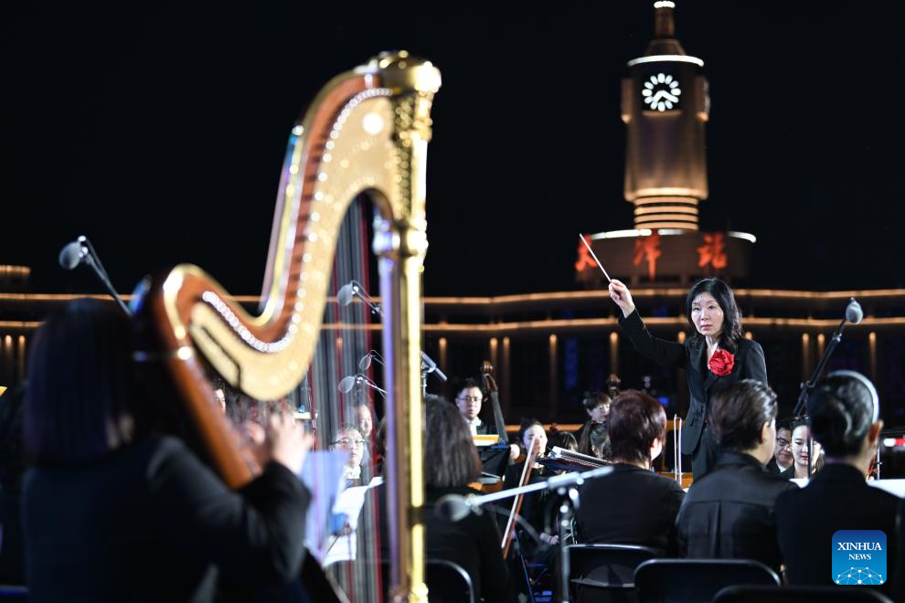 Tianjin Symphony Orchestra performs at the Jinwan Square by the Haihe River in north China's Tianjin, April 18, 2026. The Bridgeside Music Series kicked off here on Saturday. This event has been held for two consecutive sessions, and this year's performances will last until October.