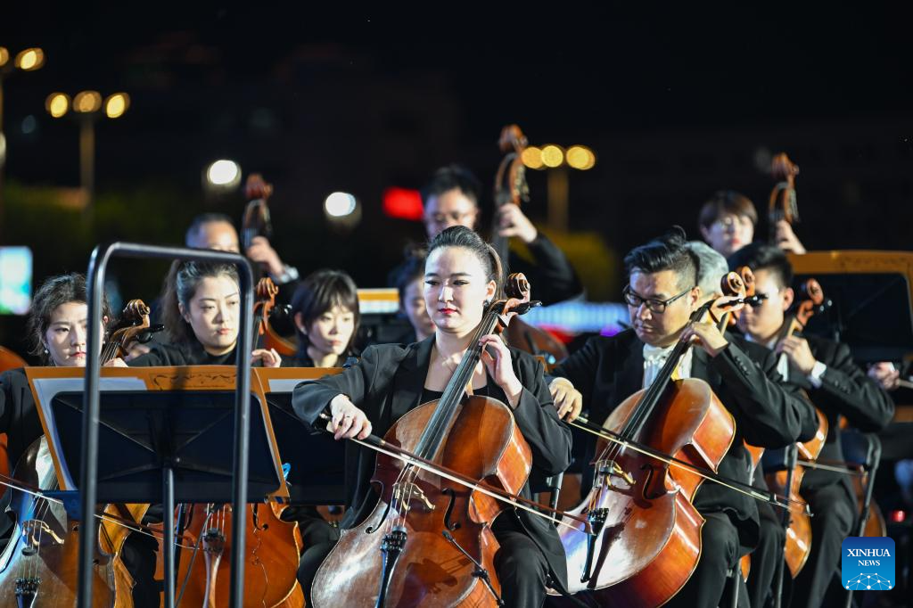 Members of Tianjin Symphony Orchestra perform at the Jinwan Square by the Haihe River in north China's Tianjin, April 18, 2026. The Bridgeside Music Series kicked off here on Saturday. This event has been held for two consecutive sessions, and this year's performances will last until October.