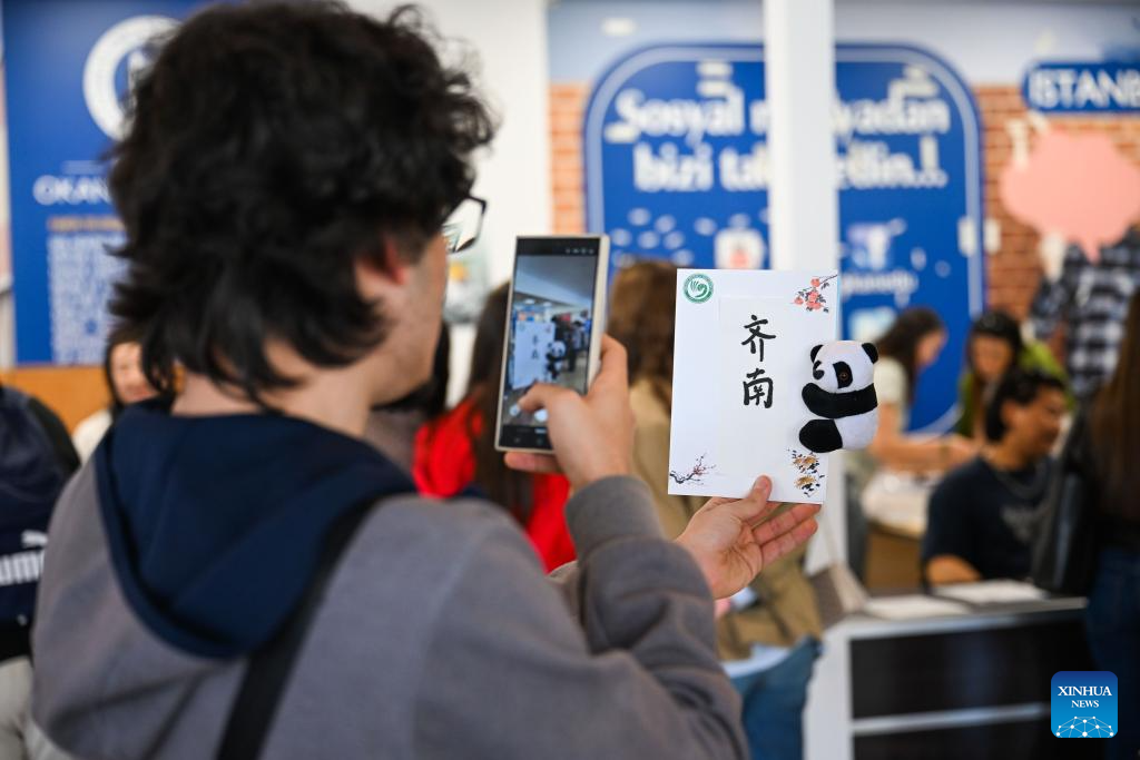 A university student takes a photo of his Chinese name at Okan University in Istanbul, Türkiye, on April 20, 2026. The Confucius Institute at Okan University in Istanbul, Türkiye, hosted a variety of activities to celebrate the International Chinese Language Day on Monday. (Xinhua/Liu Lei)