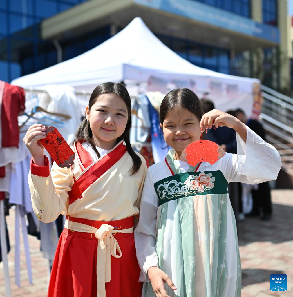 Students in costumes with tradition Chinese elements pose for photos at the 2026 International Chinese Language Day event in Almaty, Kazakhstan, April 20, 2026. A celebration event marking the 2026 International Chinese Language Day was held here Monday. (Xinhua/Li Renzi)