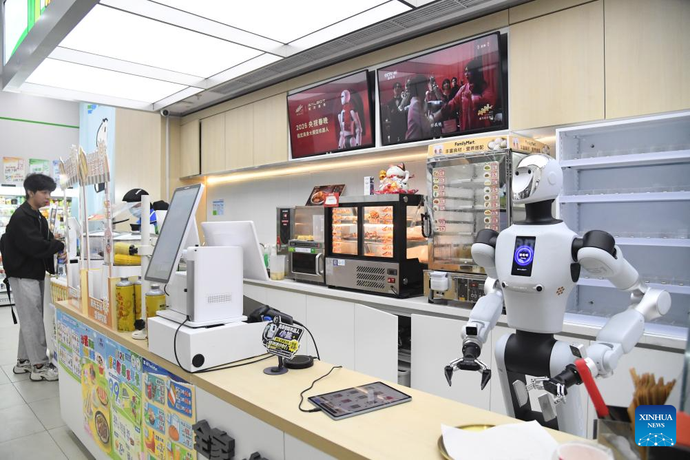 A humanoid robot works at a convenience store in Haidian District of Beijing, capital of China, April 22, 2026. An embodied large model robot has recently been deployed in a convenience store in Haidian District to provide regular service. The robot is responsible for greeting customers, answering product inquiries, providing promotion information, and delivering goods. (Xinhua/Ren Chao)