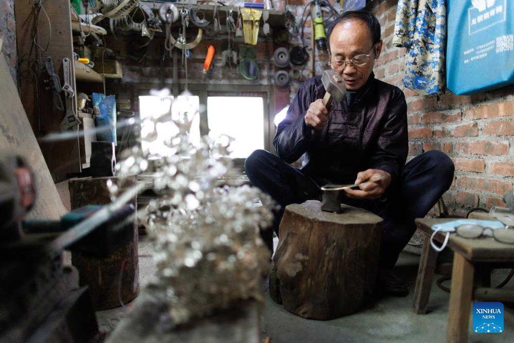 A silversmith works on a silver ornament in Shuikou Township of Liping County, southwest China's Guizhou Province, April 21, 2026.