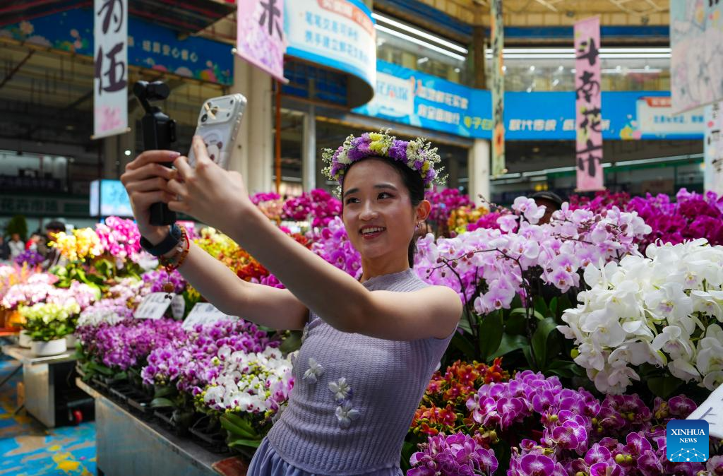Chinese American Sherry Zhu takes a selfie in front of flowers at Dounan Flower Market in Kunming, southwest China's Yunnan Province, April 24, 2026. (Xinhua/Chen Xinbo)