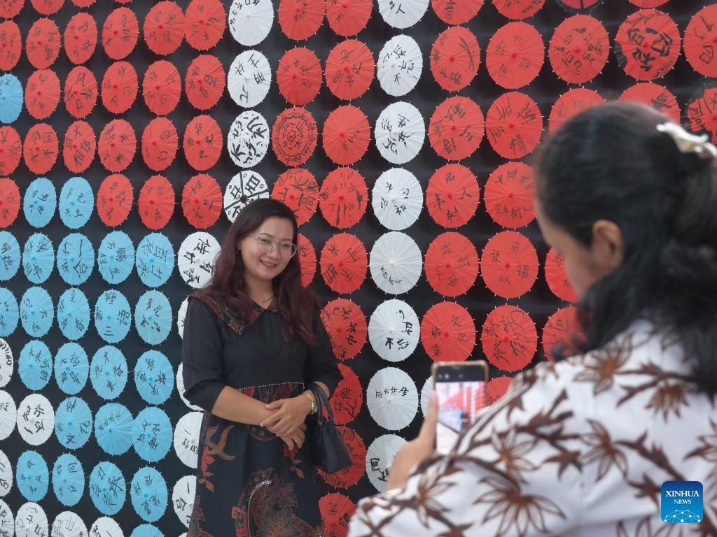 A woman poses for photos with an art wall displaying paper umbrellas at Puhua Trilingual School in Purwokerto, Central Java Province, Indonesia, April 25, 2026. (Xinhua/Li Fuyu)