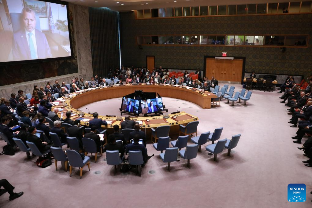 The UN Security Council holds an open debate on the safety and protection of waterways in the maritime domain, at the UN headquarters in New York, April 27, 2026. UN Secretary-General Antonio Guterres on Monday called for the reopening of the Strait of Hormuz at a Security Council open debate on the safety and protection of waterways in the maritime domain. (Xinhua/Xie E)