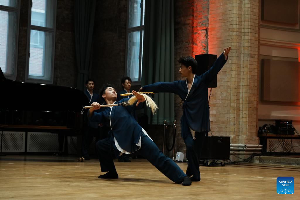 This photo taken on April 27, 2026 shows a performance by students from South-Central Minzu University based in Wuhan, central China's Hubei Province, in Manchester, Britain.