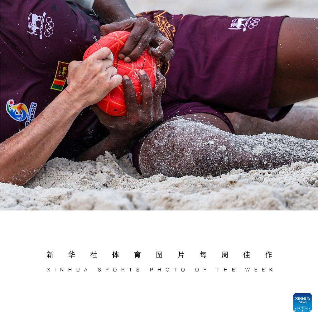 Mannapperuma Mudiyanselage of Sri Lanka competes during the beach handball men's preliminary round group A match between China's Hong Kong and Sri Lanka at the 6th Asian Beach Games in Sanya, south China's Hainan Province, April 23, 2026. (Xinhua/Li Bo)